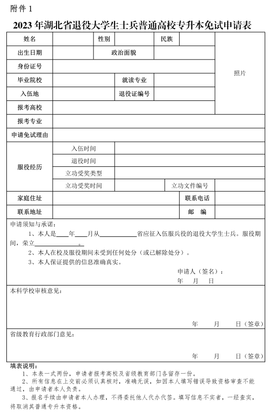 第一阶段,3月5日8: 00至9日18: 00进行预报名。符合报 名资格条件的退役大学生士兵登录报名平台,按要求如实填写《2023 年湖北省普通高等学校退役大学生士兵专升本申请表》,同时上传本 人照片、身份证、退出现役证、普通全日制专科毕业证书(应届毕业 生提供学籍证明)、入伍地证明(“入伍地证明”材料一栏上传经批 准入伍地县级人民政府征兵办公室签字盖章和考生本人签字的预报 名表、立功受奖证明等材料。